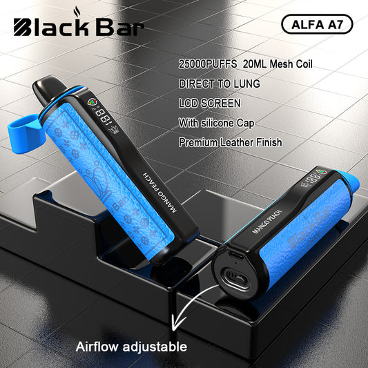 BLACK BAR-ALFA A7 20ML 25000PUFFS DIRECT TO LUNG LCD SCREEN Airflow adjustable With silicone Cap Premium Leather Finish Mesh Coil